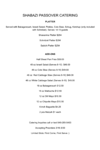 Saturday Night, April 4, 2026 – Shabbat ends 8:05 pm. We will open about 1 hour after with Chol Hamoed menu.