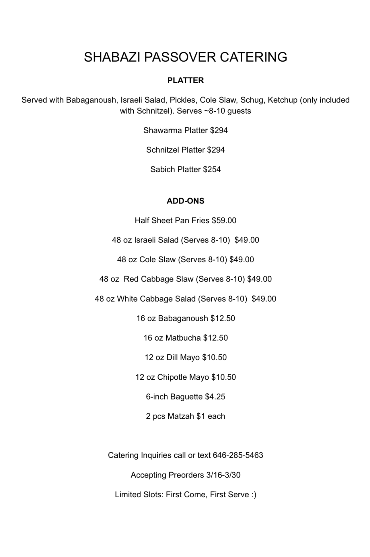 Our sister restaurant next door, Shawarma Shabazi, will be open on Chol Hamoed as well. For catering menu, Click Here.